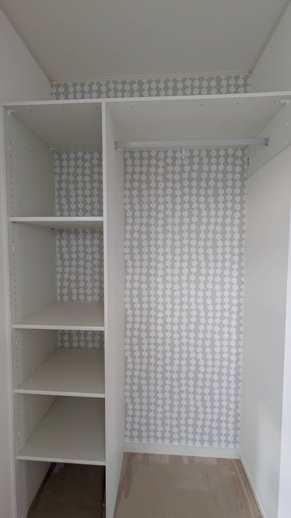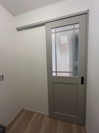 キッチン前にはちょっとしたスペースを利用して、収納棚を設置しました。