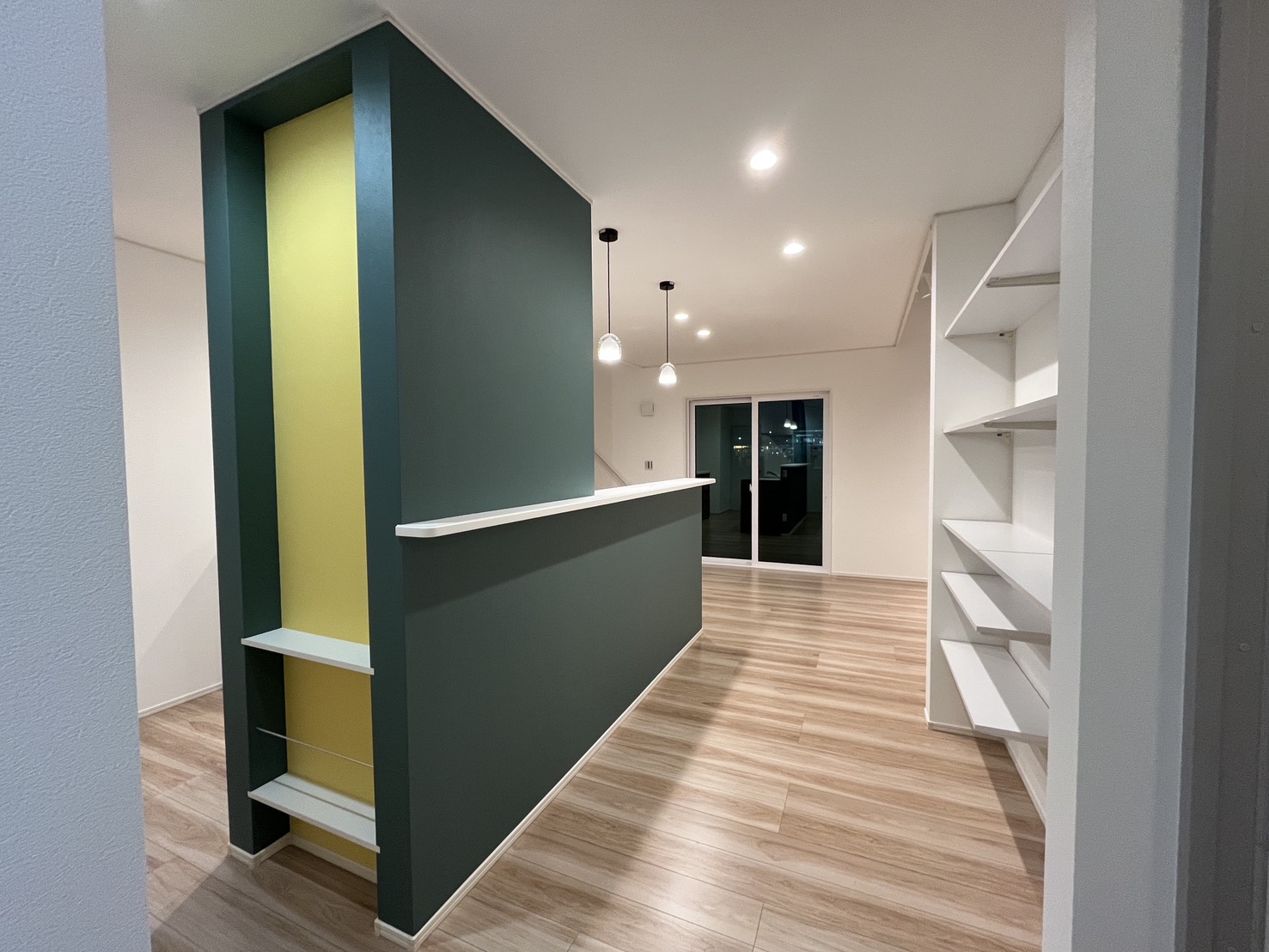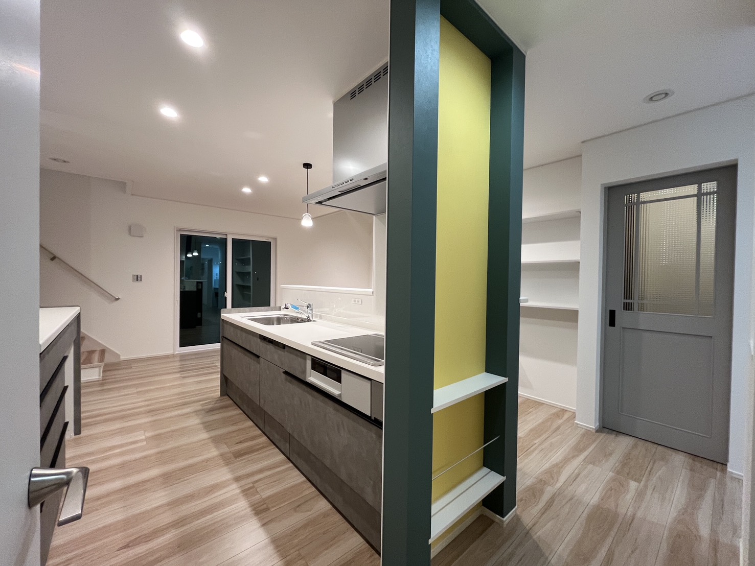 キッチン前にはちょっとしたスペースを利用して、収納棚を設置しました。